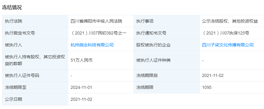 天眼查显示,11月2日,杭州微念品牌管理有限公司(曾用名杭州微念科技有限公司)新增股权冻结信息,股权数额51万人民币,冻结期3年,股权被执行的企业为四川子柒文化传播有限公司,执行法院为四川省绵阳市中级人民法院。