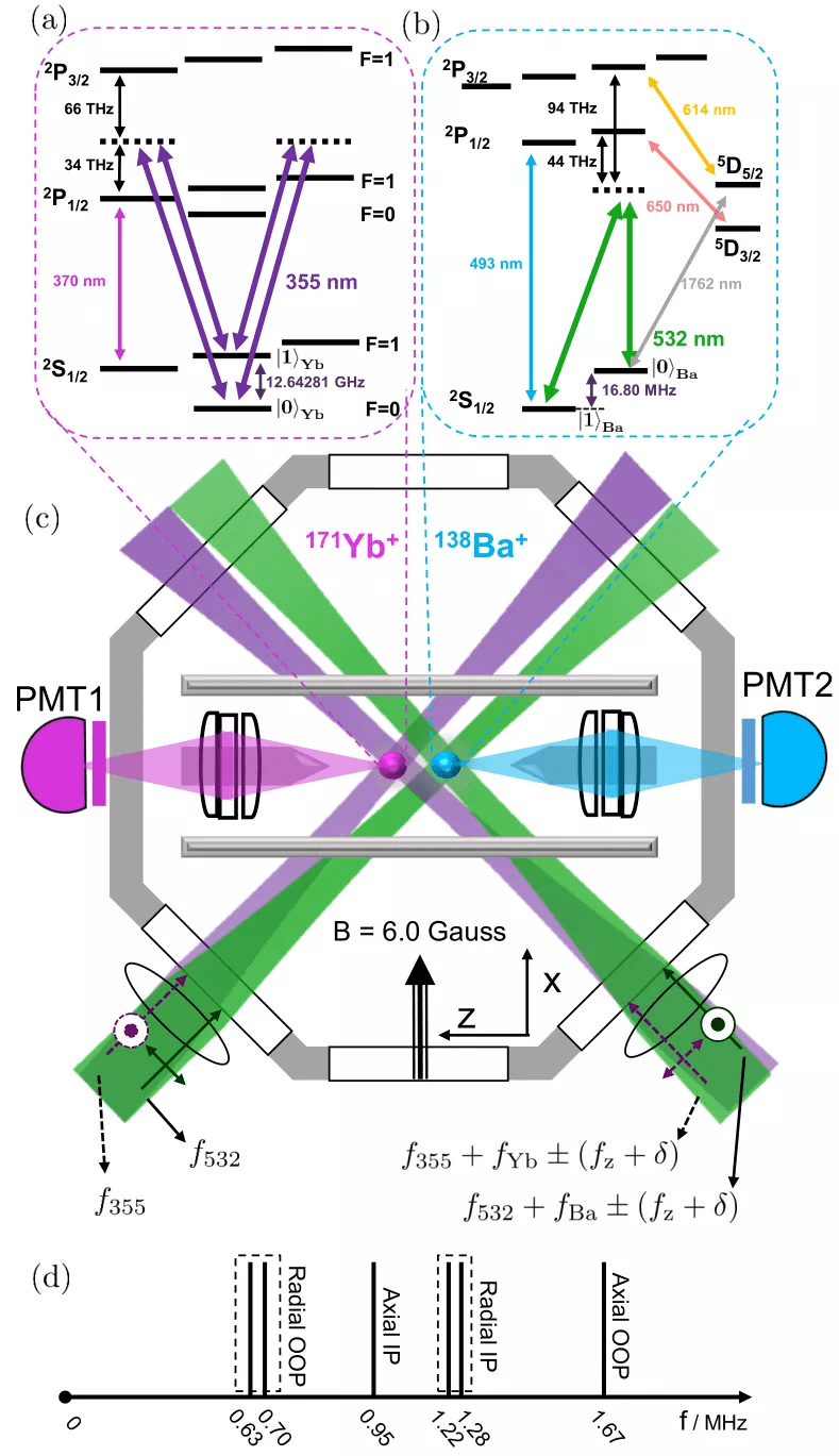 混合双离子系统包含囚禁在保罗阱中的一个Ba离子和一个Yb离子。量子互文性不等式的每对观测量分别对应一对不同的离子,并且两个离子具有完全不同的操作激光、探测激光以及探测装置,从而关闭了兼容性漏洞,增强了兼容性。实验结果清楚地显示了量子互文性不等式的违背,并开拓了证明量子系统的途径。