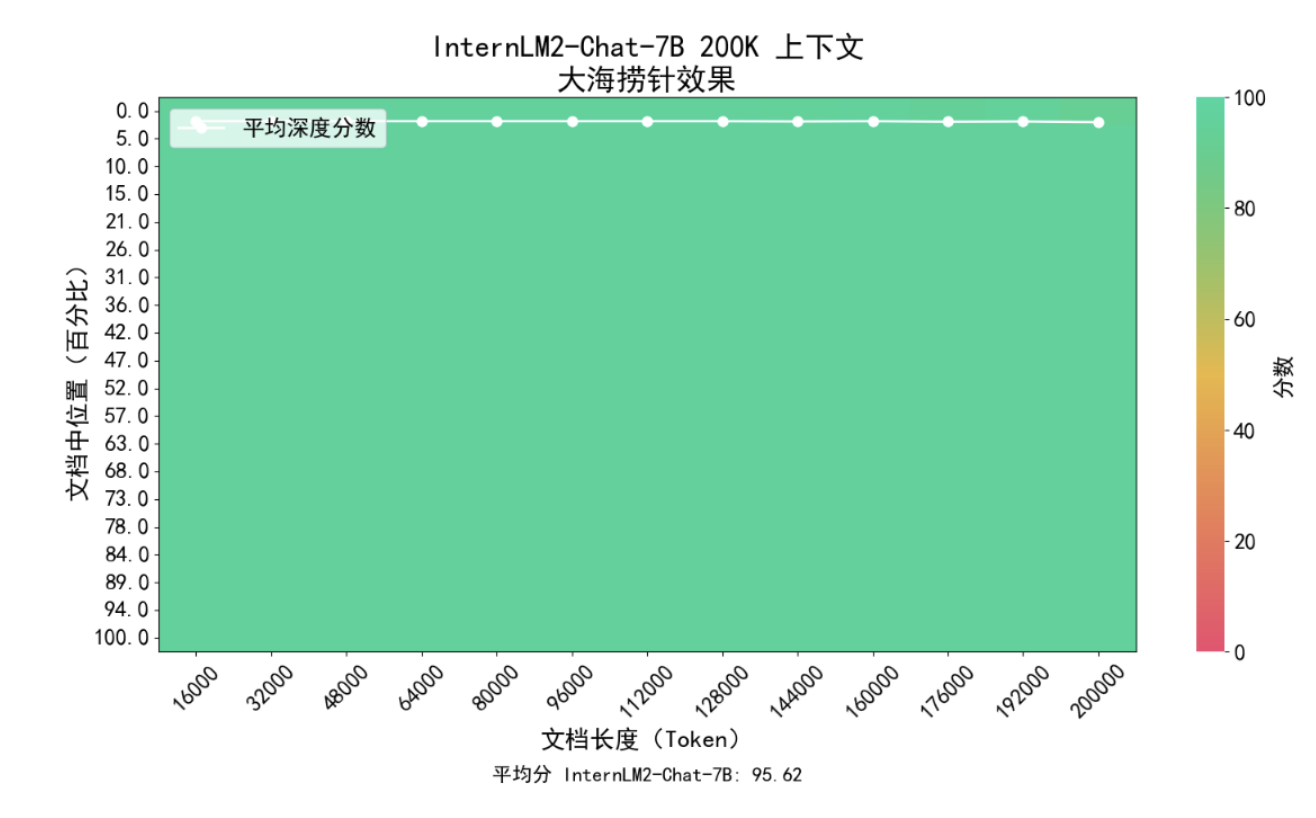 上图展示了InternLM2在不同长度的上下文(横轴)及上下文中不同位置(纵轴)上召回关键信息的准确率(Recall)。红色代表较低的召回准确率,而绿色则代表较高的召回率。上海人工智能实验室表示,试验结果表明,InternLM2在上下文长度延展到200K时依旧保持了近乎完美的召回成功率,验证了InternLM2对于超长上下文坚实的支持能力。