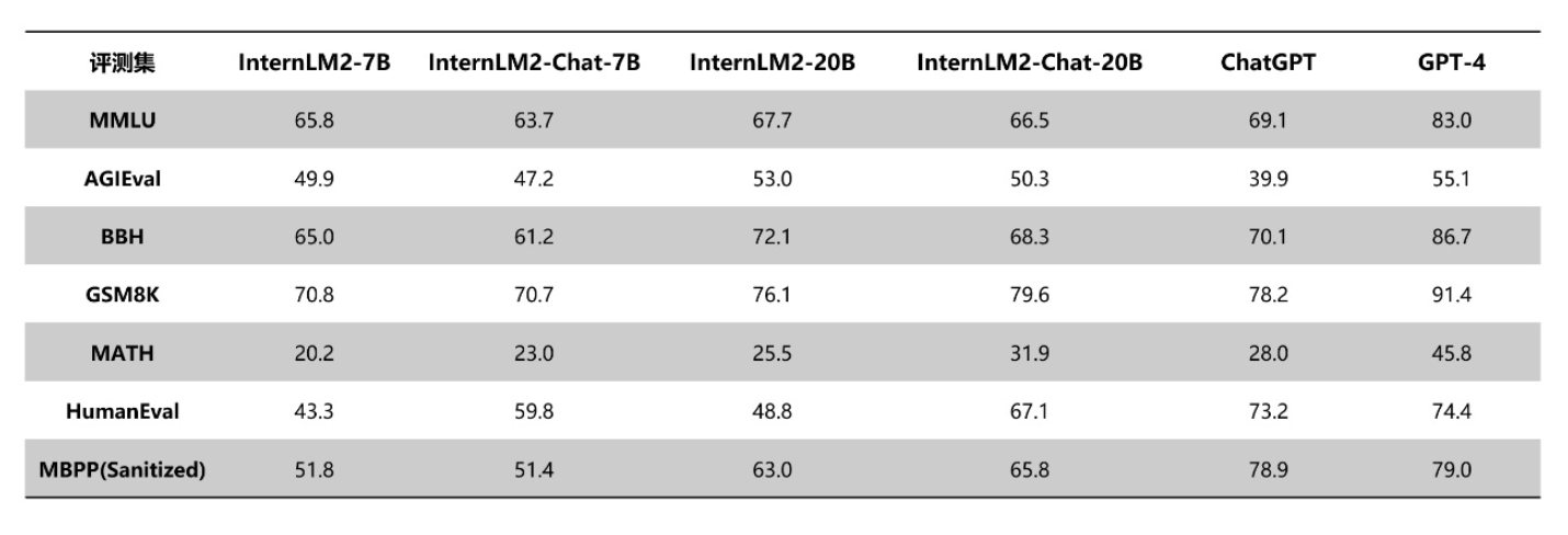 表格对比了InternLM2各版本与ChatGPT(GPT-3.5)以及GPT-4在典型评测集上的表现。InternLM2只用20B参数的中等规模即在整体表现上达到与ChatGPT比肩的水平。