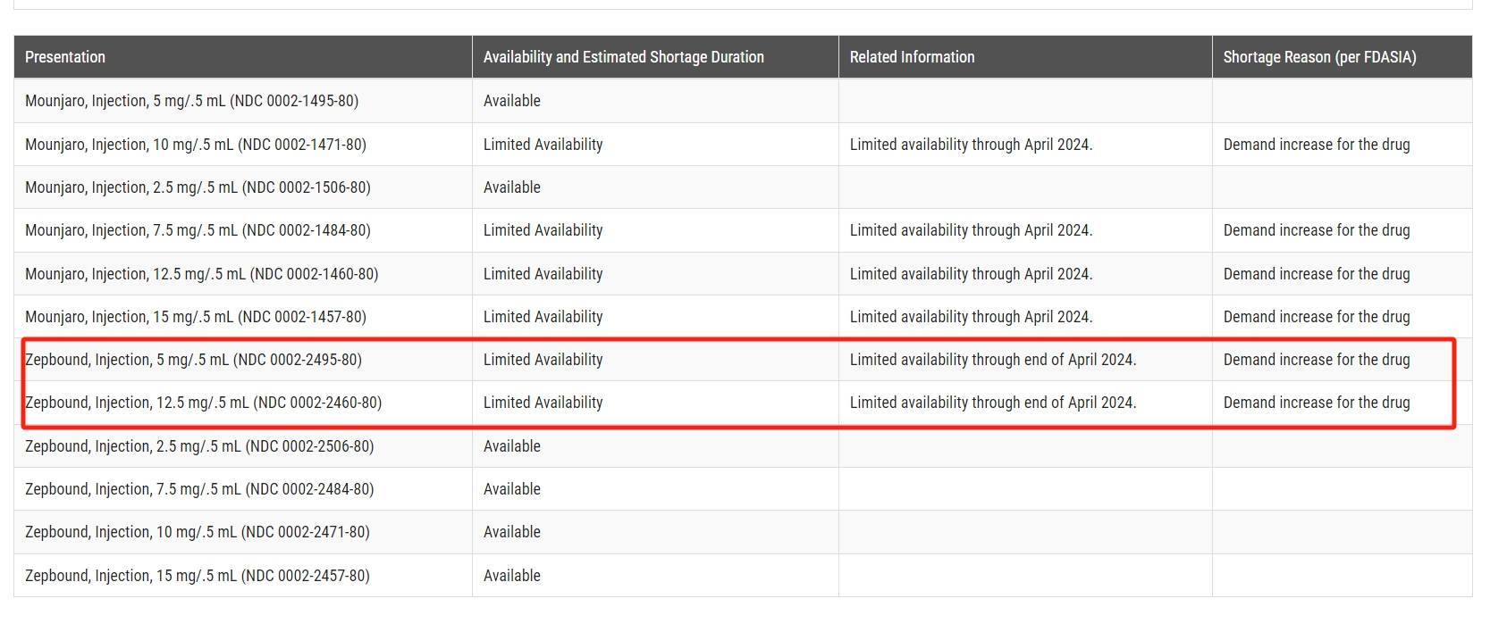 目前,美国食品药品监督管理局官网的药物短缺数据库还包括礼来的Tirzepatide,5mg和12.5mg的Zepbound以及10mg、7.5mg、12.5mg、15mg的糖尿病版Mounjaro均供应有限。在中国,Tirzepatide的糖尿病适应证也早已申报上市,等待获批。