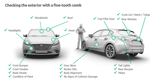 整个验车时间大概2小时,从汽车包括车辆的车灯,空调,发动机,把手是否正常工作到车辆的每一处擦伤和掉漆。 ,都会在Beepi网站上以“√”“×”逐一表示,并配以车身图示表示凹痕或是划痕位置,总共185项,最后生成一份评估报告。