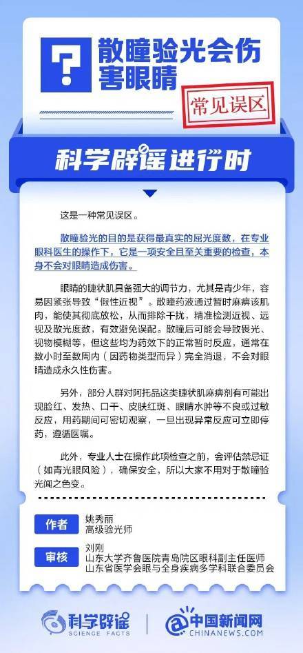 散瞳验光的目的是获得最真实的屈光度数,在专业眼科医生的操作下,它是一项安全且至关重要的检查,本身不会对眼睛造成伤害。散瞳后可能会导致畏光、视物模糊等,但这些均为药效下的正常暂时反应。(转自:@科学辟谣 @中国新闻网 )
