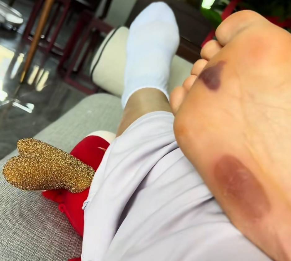 薛女士称刚开始10多分钟时感觉蛮有效果,到了15分钟的时候疼痛加剧,但自己以为痛则不通,忍痛踩到20分钟时脚底板突然喷血,发现有大面积血泡且有的已被磨破。