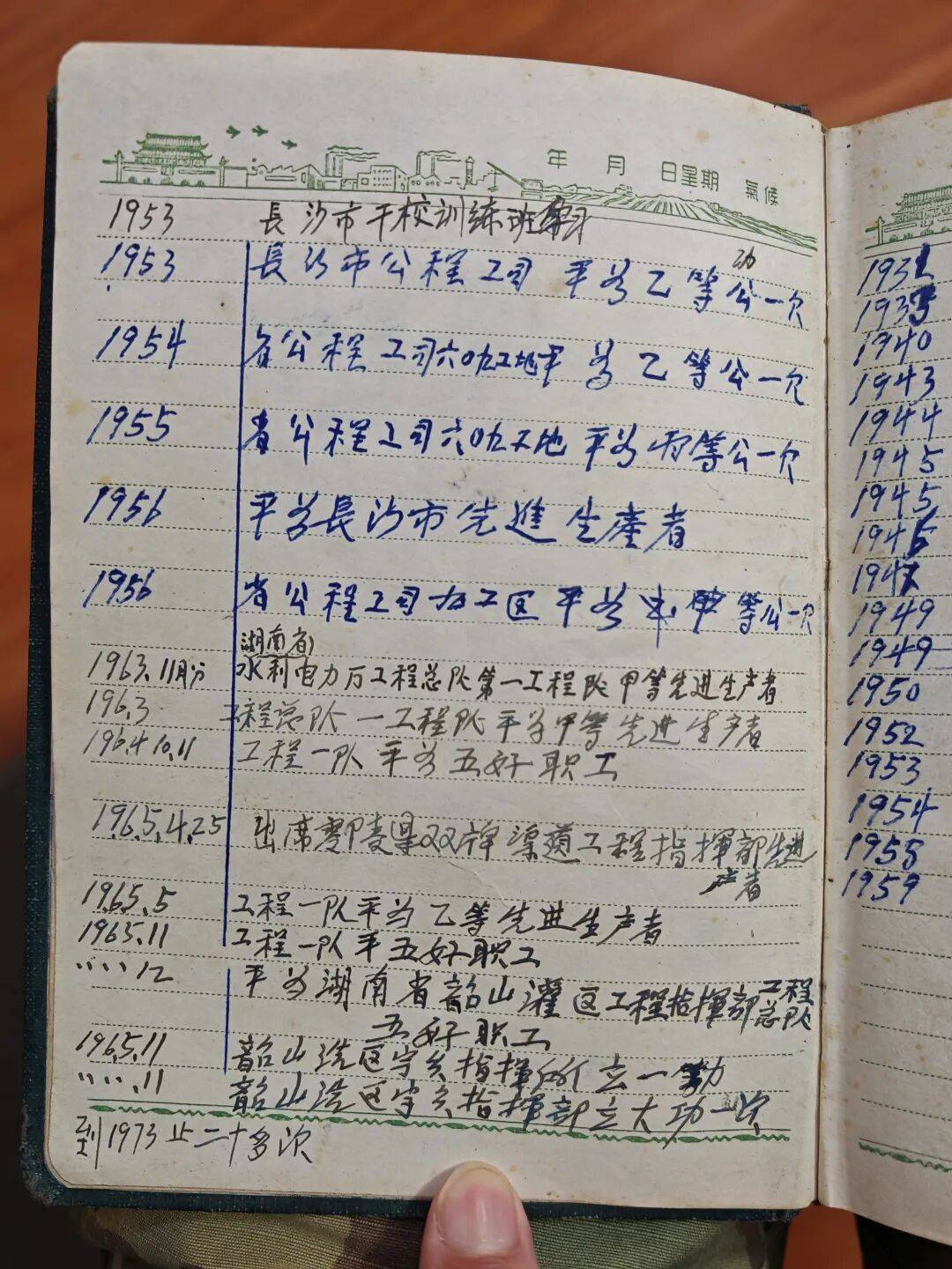 俞振藩将他从七岁起的经历都写在了一个老旧的笔记本上。几乎每一年,他都在单位上有立功,屡屡获评单位的“五好职工”、“先进工作者”等荣誉,1956年,俞振藩获评“长沙市先进生产者”。
