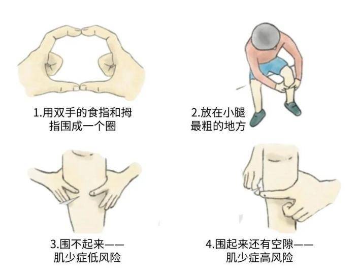 这是一个简单直观的初筛方法。用双手的食指和拇指环绕住非优势腿的小腿最粗处。如果指环能合拢且略有空隙,说明你的肌肉量可能已经不足,需要引起注意。