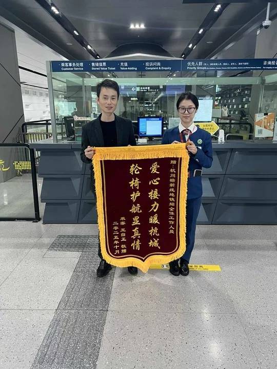 在11月3日和7日,“老熟人”王先生专程带着锦旗,分别送至地铁塘新线站和萧山国际机场站,以此表达对地铁工作人员这些天来暖心服务的诚挚谢意。